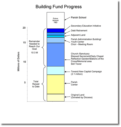 Planning for the future of the parish is challenging and exciting! Some uncertainty exists with respect to future parish needs, and different parishioners tend to have a variety of preferences and priorities when it comes to the services and support they would like to have. One role of the church councils is to continue to consider all of these matters in making the best decisions for the long-term good of the parish as a whole. The above graphic indicates “where we have been” and “where we are going.” While we have come a long way, we realize we still have a long way to go! Parishioners’ continued support to the Building Fund is still earnestly needed. |