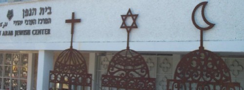 This is the front of the Arab-Jewish Center in Haifa, Israel. The Center is working for peace and harmony among people. The symbols of the three faiths side by side is so refreshing to see. It is a reminder that Jews, Christians and Muslims are all children of Abraham, our ancestor in Faith!