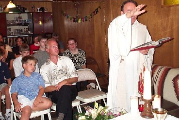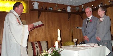 The four pictures above show the Saur celebration on Sunday September 3,2000 that was so sweet: Bob and Doreen, their children and grandchildren, and the celebrant who was privileged to be there as the couple of 50 years renewed their vows and pledged "until death do we part" and celebrated the wonder of God and His covenant!