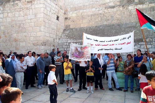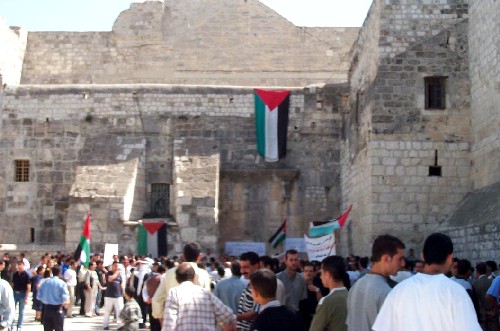 This demonstration took place in front of the Church of the Nativity in Bethlehem on Sunday, October 8. Notice the Palestinian flags attached to the Church, which is a Christian holy site built over the traditional site of the cave in which Jesus was born.
