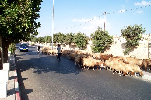 The old and new collide in many ways and through many layers of thinking and activity. A shepherd and his flock on the road to Bethlehem.