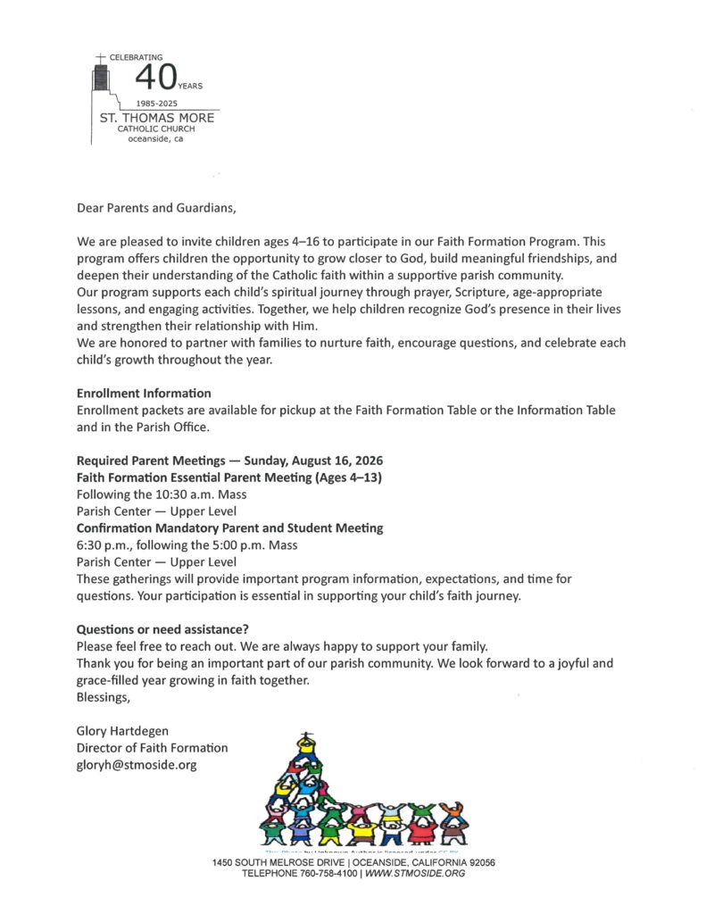 We are currently enrolling for the 2026-2027 sessions. Please pick up a registration packet from the Information Table or in the Parish Office. We will be on the Plaza Sunday