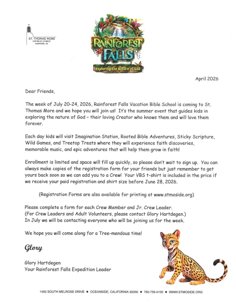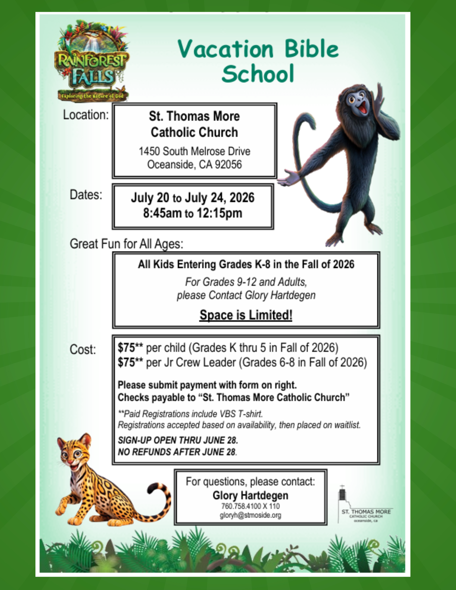 The week of July 20-24 Rainforest Falls Vacation Bible School is coming to St. Thomas More and we hope you will join us! It’s the summer event that guides kids in exploring the nature of God – their loving Creator who knows them and will love them forever.